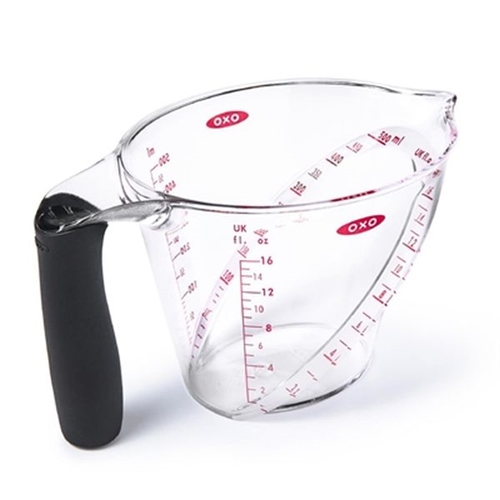 The 500ml OXO Good Grips angled measuring jug is the perfect solution for accurate measuring and pouring. With its patented angled surface, the jug allows you to see measurement markings from above as you're pouring, so you can better measure ingredients without bending or lifting the cup to eye level.