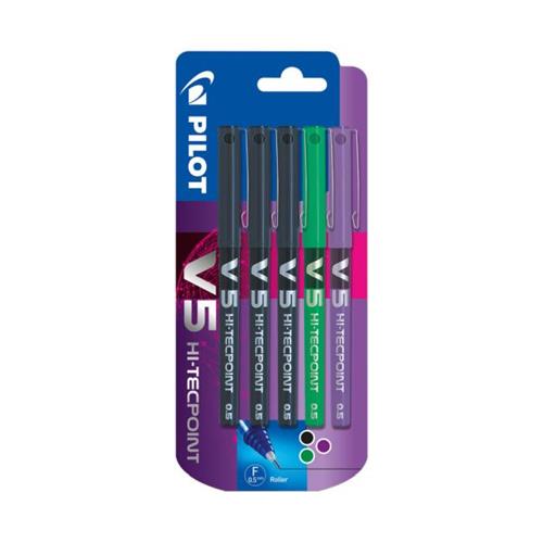 Pilot V5 Hi-Tecpoint Liquid Ink Rollerball Pen 0.5mm Tip 0.3mm Line 3 x Black/1 x Green/1 x Purple (Pack 5) - 3131910541127