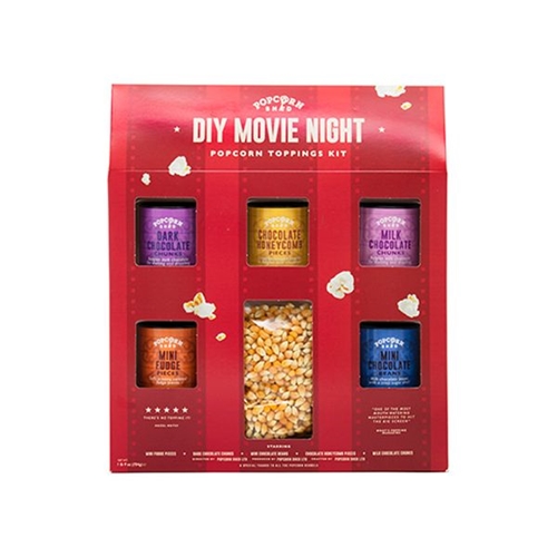 DIY Movie Night Popcorn Toppings Kit (Mini Fudge Pieces, Mini Chocolate Beans, Chocolate Honeycomb Pieces, Milk Chocolate Chunks, Dark Chocolate Chunks & Popping Kernels)
