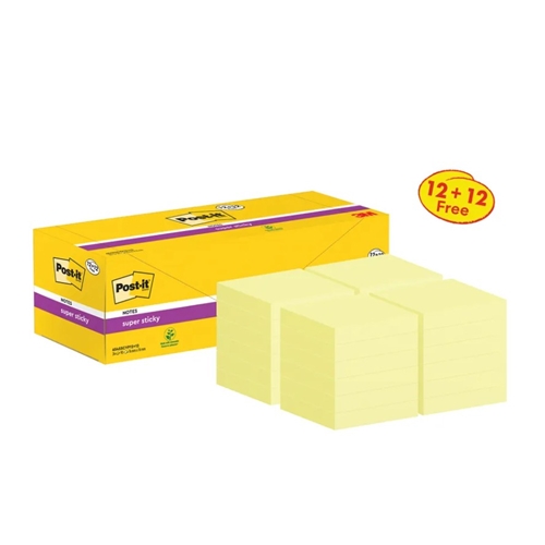 Post-it Super Sticky Notes 76x76mm 90 Sheets Canary Yellow VALUE PACK 12 + 12 FREE (Pack of 24) 654S