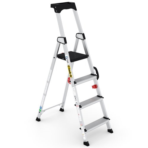 Light & practical aluminium frame with a glass fibre reinforced polypropylene platform 100mm wide treads with serrated surface to prevent slips Multifunctional tool tray Non-slip feet Maximum load capacity of 150kg