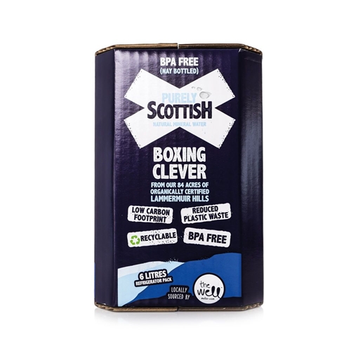 Purely Scottish Natural Mineral Water is sourced from the Lammermuir Hills in Scotland from 83 acres of organic lands. Naturally alkaline mineral water, delicious and refreshing. This 6 litre size is ideal for use from a standard domestic fridge, fitting neatly into the door. The strong, eight-sided box is fully recyclable. At a convenient size to lift and load. Bisphenol A (BPA) free. Ideal for use in the home or workplace shared kitchens.