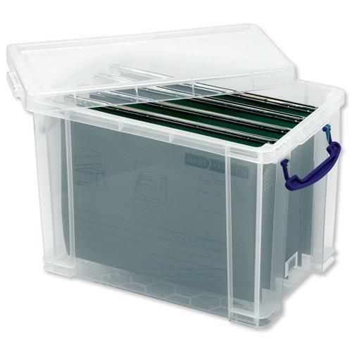 This Really Useful storage box is suitable for A4 suspension files for handy filing and storage in the office or at home. The box is made from durable polypropylene with a separate lid and integrated carry handles. Stackable and stable, this clear storage box has a 19 litre capacity and measures W375 x D255 x H290mm.