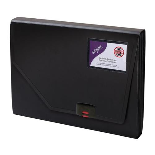 This Snopake Rainbow and Black expanding file features brightly coloured dividers with index tabs and sticky labels. Perfect for organising projects, reports, presentations and more, the 13 part divider can hold up to 650 sheets of A4 paper. The black file also features a business card holder and push lock closure to help keep contents secure.