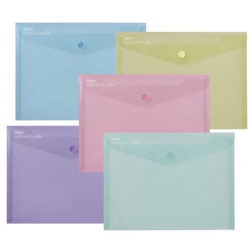 This Snopake Reborn Polyfile in A5 size is an ideal travel companion, the popper wallet is perfect for storing important travel documents like passports, tickets, money and insurance documents in this water-resistant wipe-clean folder. Can hold up to 75 sheets of paper. Snopake ReBorn is made from 100% recycled, heavy-gauge and tough polypropylene, the responsible and eco-friendly choice. with a 5 year guarantee. The attractive transparent superline finish in soft pastel hues, is ideal for quick and easy identification of contents, secured by a colour coordinated press-stud closure.