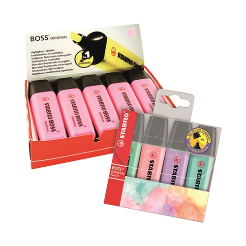 The Stabilo BOSS Original with it's distinctive shape and ultra fluorescent colours, is a high quality highlighter that writes further, lasts longer and will not dry out. The wedge shape tip can be used to draw broad and fine lines, making it perfect for highlighting, underlining text and even colouring. The Anti Dry Out Technology means the cap can be left off for up to 4 hours and the super bright colours will not fade. This pack contains 10 pink highlighters plus 4 assorted pastel highlighters free of charge.