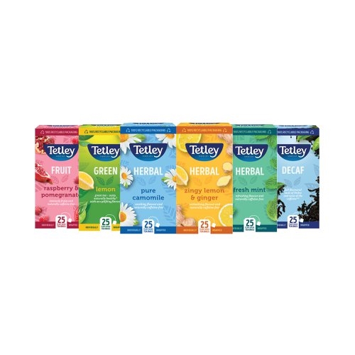 Including a selection of some of Tetley's favourite, premium-enveloped teas, this variety packs is ideal for caterers and casual tea drinkers alike. The Tetley Variety Box is bursting with natural and intense fruity flavours to satisfy any palate, including the below flavours: Raspberry & Pomegranate; Decaf; Zingy Lemon & Ginger; Fresh Mint; Camomile; and Green Lemon. Each flavour contains 25 tea bags. This pack contains 150 tea bags in total (6 x 25).