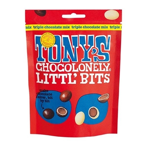 Experience three times the chocolate and three times the munch factor with Tony's Triple Chocolate Mix! Indulge in chunky layers of dreamy milk chocolate, rich dark chocolate and super smooth white chocolate, all blended into three irresistible flavours. Tony's Chocolonely Littl' Bits are fun-sized chocolate pieces inspired by the full-sized bars, conveniently packaged in 100g pouches.