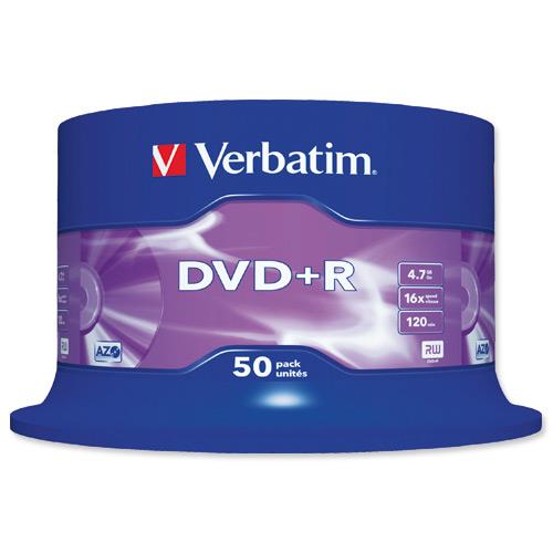 Verbatim DVD+R Matt Silver Recordable Disk Write-once Spindle 16x Speed 120min 4.7Gb Ref 43550 - Pack 50